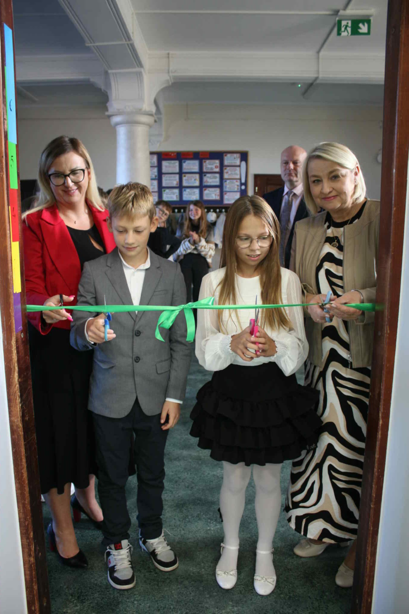 Pani Burmistrz oraz Pani Dyrektor wieleńskiej jedynki wraz z Uczniami symbolicznym przecięciem wstęgi otworzyli nową pracownię.